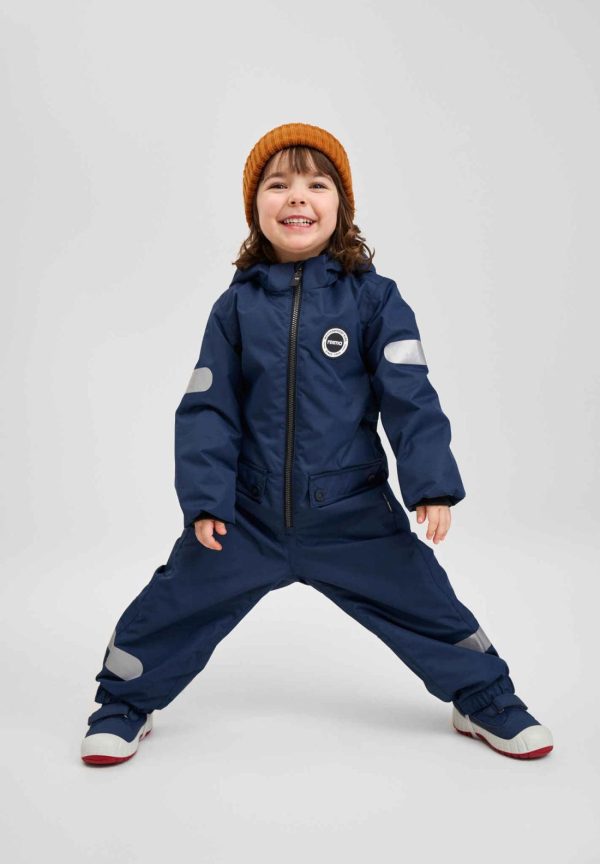 ReimaTec kids’ waterproof outdoor jumpsuit with light insulation, in a timeless design and straight fit. Big reflective details.