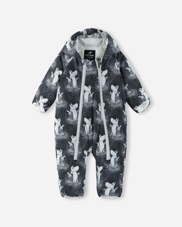 The material of this warm Moomin snowsuit for babies is water-repellent, windproof and breathable. The fiber content of the main material and the insulation is recycled and the cotton in the lining is organic. Designed with care and the baby’s comfort in mind, this Reima one-piece has a lowered neck line: the soft structure prevents the zips from scratching your little one’s skin. Two long zippers for easy dressing. The fold-over sleeve and leg ends protect the baby’s hands and feet, so no need for extra accessories.